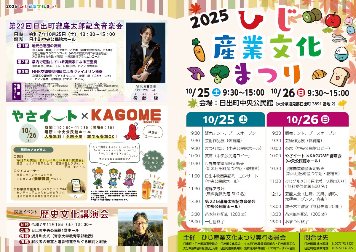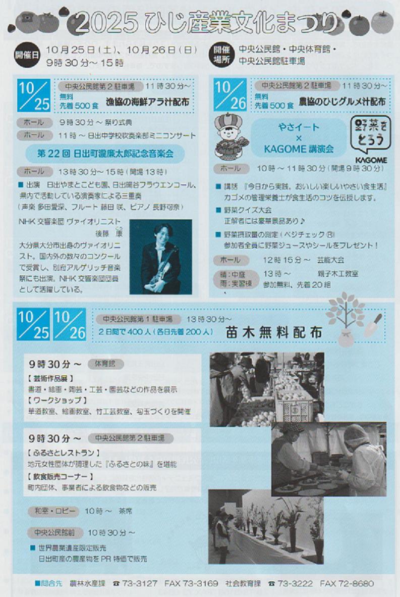 | 主催:ひじ産業文化まつり実行委員会:日出町・日出文化協会・べっぷ日出農業協同組合・日出町商工会・大分県漁業協同組合日出支店 ・別府速見森林組合・ひじ町ツーリズム協会 |