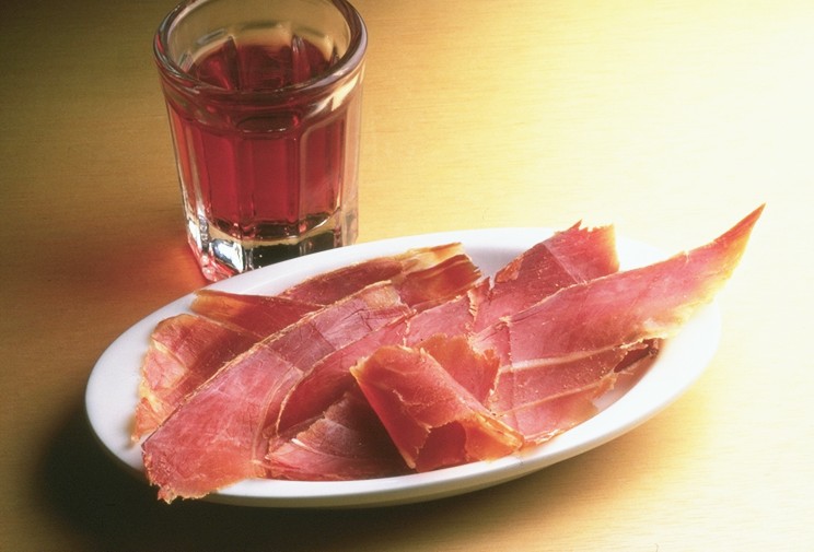 豚のモモ肉を丸のまま3週間ほど塩漬けにして一年以上じっくり熟成、乾燥させて作りあげる。